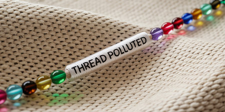 Close-up of textured fabric with a string of colorful beads and the words Thread Polluted.