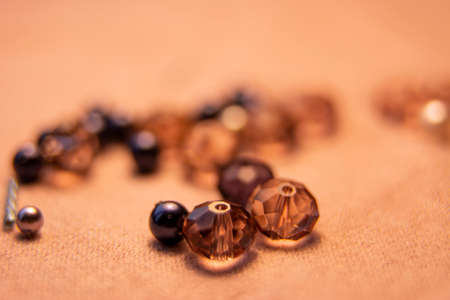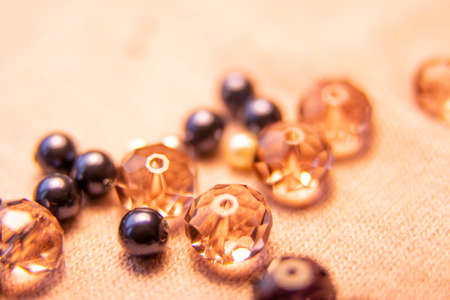 Colorful glass beads and crystals. Variety of shapes and colors to make a bead necklace or a string of beads for women.Blurred photo.