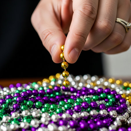 A square, editorial photograph focusing intensely on a hand sorting highly reflective Mardi Gras bea