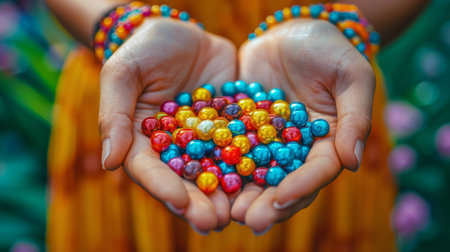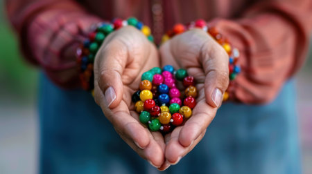 A pair of hands gently cradles an array of vibrant, colorful beads, showcasing artistic craftsmanship and inviting creativity in a natural outdoor setting.