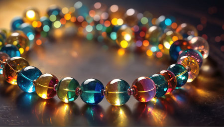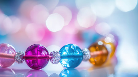 Close-up of vibrant glass beads on a string with a soft bokeh background, creating a playful and colorful composition ideal for crafts and design projects.