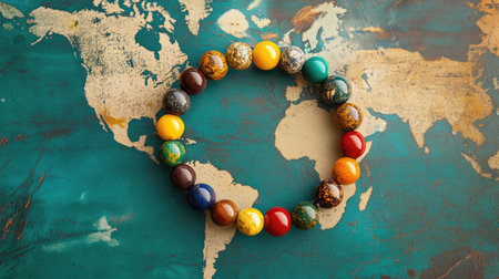 This striking image features a colorful beaded bracelet arranged thoughtfully on a vintage world map, highlighting global artistry and craftsmanship. Perfect for showcasing vibrant fashion and design elements.
