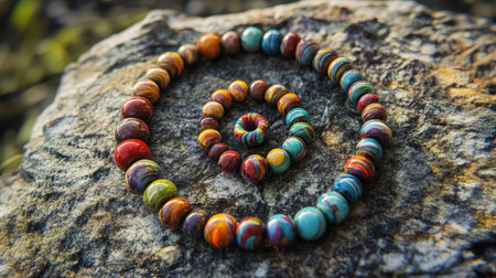 Beautifully arranged handmade beads in vibrant colors spiral on a stone surface, creating an eye-catching and artistic display perfect for jewelry lovers.