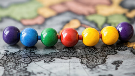 Close-up of vibrant wooden beads arranged on a detailed world map, symbolizing travel and exploration. Ideal for creative and educational projects.