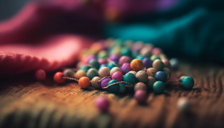 AI Generated. Colorful assortment of glass beads arranged on a wooden table in natural light setting