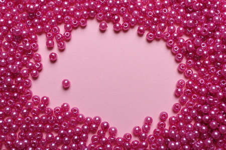 Frame of bright beads on pink background, flat lay. Space for text