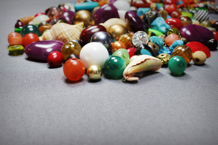 Colorful beads of various shapes and sizes on a gray background.