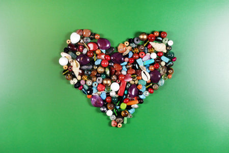 Heart made of multicolored beads and pins on a green background