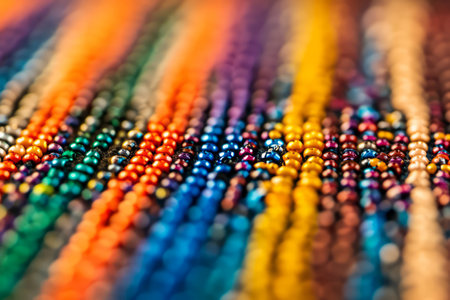 Macro shot of traditional Maasai beadwork texture, colorful tiny beads arranged in symmetrical African patterns.