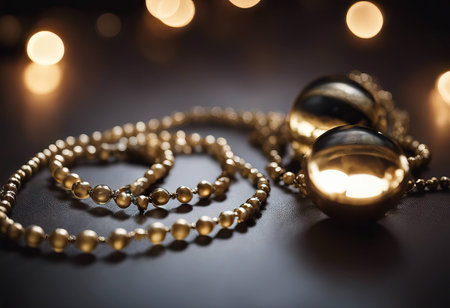 Golden and red christmas beads of string on a brown wooden background. Selective focus, bokeh.