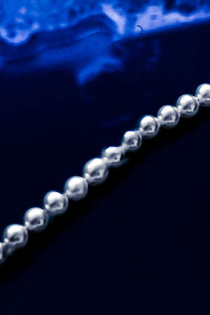 String of shiny grey beads winding through the frame in a close up view of fashion jewellery with selective focus to two beads