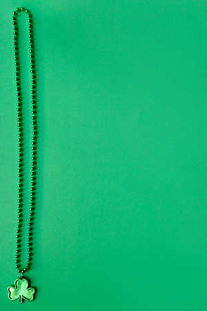 Concept of St. Patrick. Green necklace on green background, top view place for text