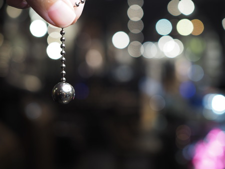 Semi round silver steel ball with chain hanging from thumb finger, with flashy bokeh background