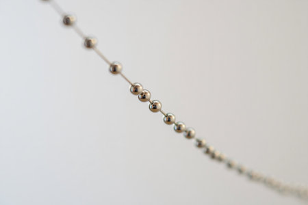 A necklace of gray beads with chain decorations on a white aesthetic background.