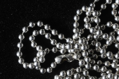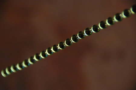 A chain of small steel balls on a wooden background.