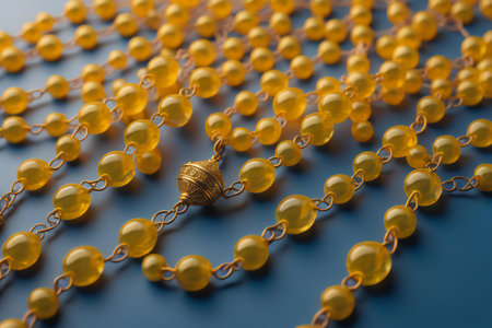 Yellow Christmas tree beads on the right edge on a yellow background with copy space