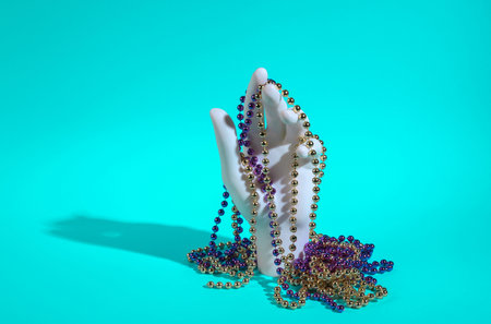 Plastic stand hand with christmas garland on turquoise background