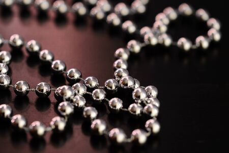 Shiny red garland on a dark surface close up. Abstract christmas background