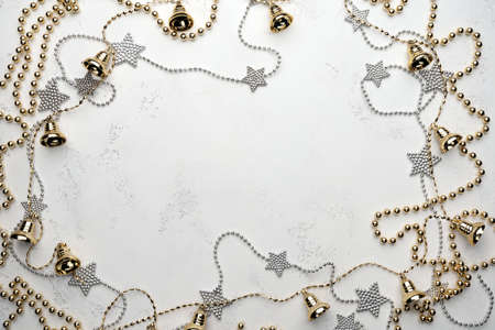 Christmas frame composition with a copy space for your design. Shiny silver and gold ribbons and beads on a white textured backdrop