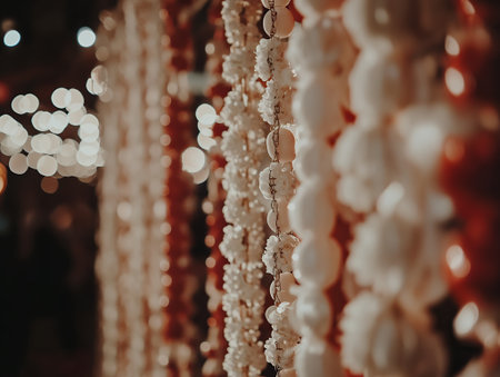 Elegant White Floral Garland Festive Decor Wedding Night Lights Bokeh Romantic Background Soft Gold