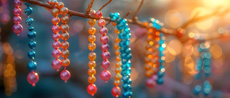 Mardi Gras celebration: Colorful beads hanging on a tree branch. Concept Mardi Gras, Celebration, Colorful Beads, Tree Branch, Festive Decorations