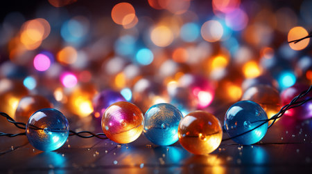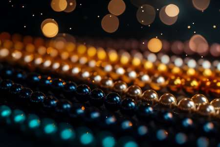 Rows of vibrant pearls in shades of blue, gold, and white create a stunning visual display. Soft bokeh lights enhance the elegance, making the scene feel enchanting and festive.