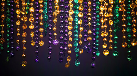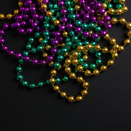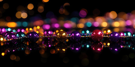 Vibrant mardi gras beads on reflective black background for festive decor