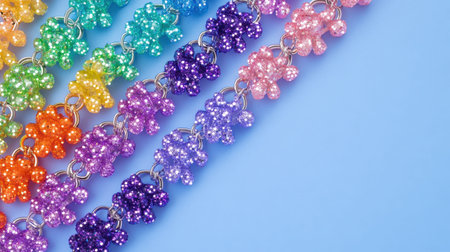 A vibrant display of colorful sparkling beaded bracelets arranged in a rainbow gradient on a soft blue background, perfect for showcasing fun fashion accessories.