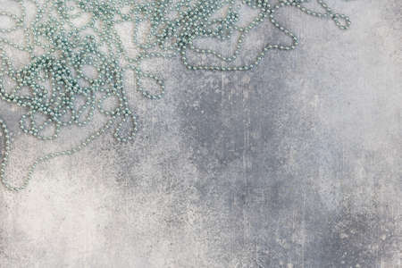 Christmas decoration with shiny beads on a gray background. Top view.