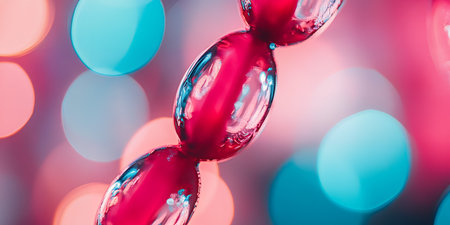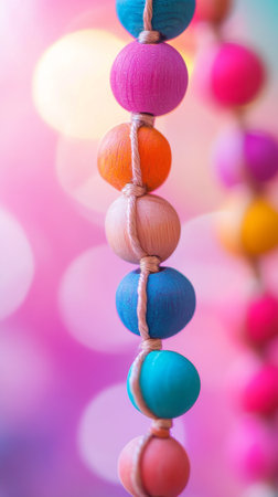 Colorful wooden beads on string with bokeh background. Artistic macro photography, vibrant design concept