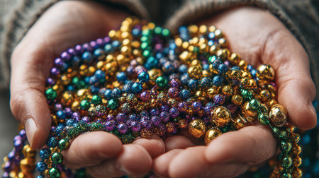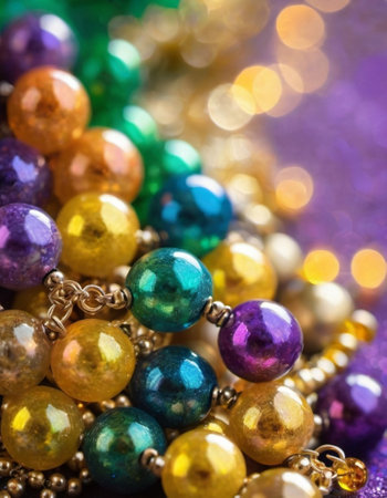 Colorful beads in purple, green, and gold create a festive atmosphere as they lay against a shimmering bokeh backdrop, embodying the joyful spirit of Mardi Gras festivities in New Orleans.