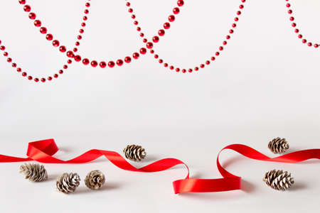 Greeting card teplate with copy blank space and white pine cones, red satin ribbon, and red ball hanging garlands.