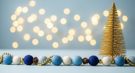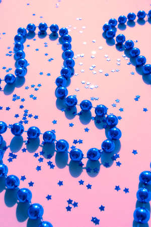 golden beads on blue background, christmas tree decoration.
