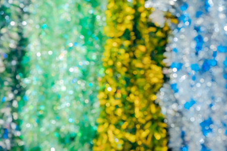 Defocused image of multicolored shiny Christmas tinsel. Background festive picture. Full screen photo. Bokeh optical effect