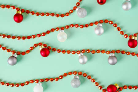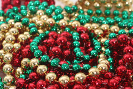 Green, Red and Gold Holiday Beads Decortation. Christmas Background