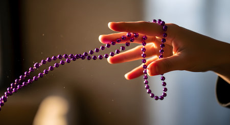 A close-up of a person's hand, backlit by warm light, holding a string of shiny purple Mardi Gras beads. The beads are draped over the fingers, and small dust particles are visible in the light. This represents celebration, parades, or the New Orleans festival.