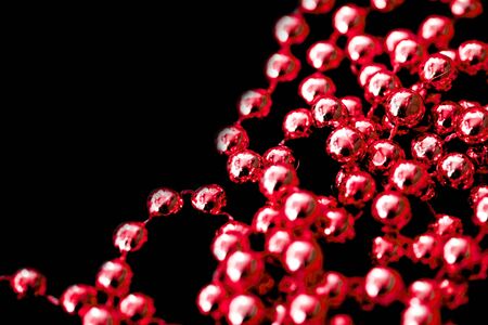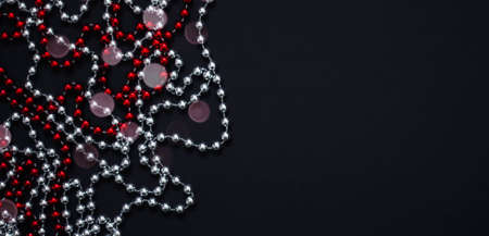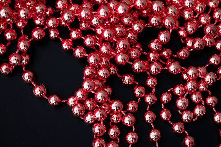 Shiny red garland on a dark surface close up. Abstract christmas background