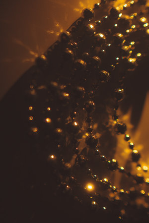 Golden and red christmas beads of string on a brown wooden background. Selective focus, bokeh.