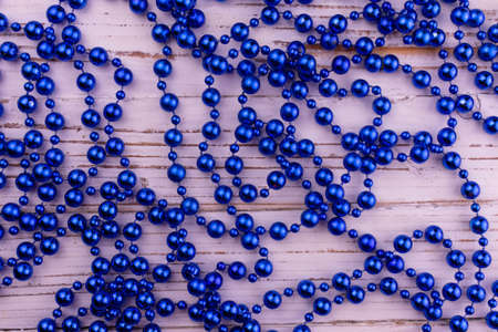 Blue beads on a white wooden background. Christmas decoration