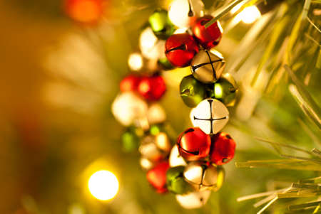 christmas garlands on a green Christmas tree, macro photography, beautiful bokeh