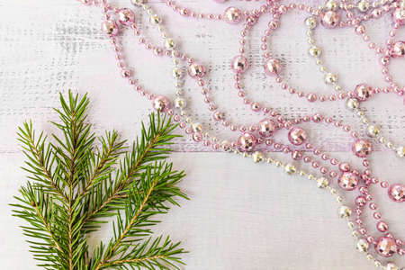 New Year eve sprigs of needles on a wooden background garland and pink and white beads
