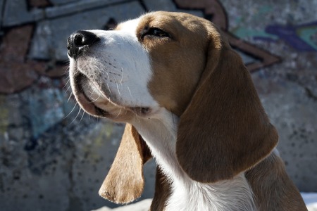Portrait of a beagle dog looking upwards, studio shot. Pet enthusiasm and curiosity concept