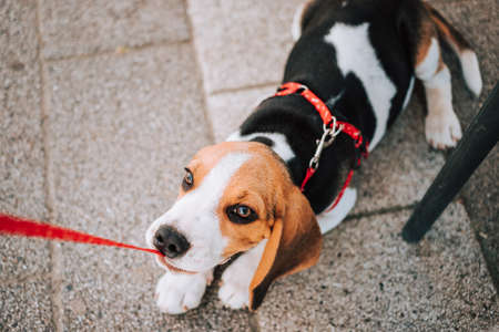 Young Beagle puppy playing with his red leash on concrete tiles.