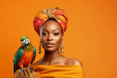 In the studio, a beautiful Cuban woman confidently poses with a tropical parrot, showcasing the vibrant colors of her culture. AI Generated.