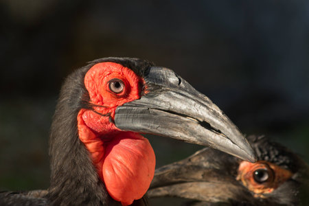 Ground Hornbill closeup portrait with front light and focus on eye