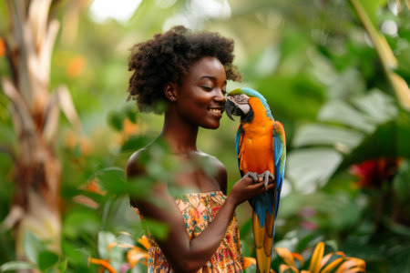 African American woman smiling while holding a colorful parrot in a lush tropical garden. Concept of woman outdoors, nature, vibrant environment, pet bird companion.