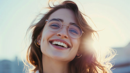 a young woman smiling while wearing glasses, in the style of joyful and optimistic, light-filled scenes