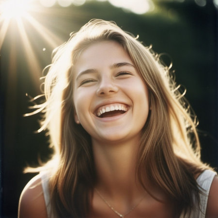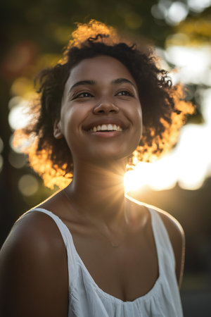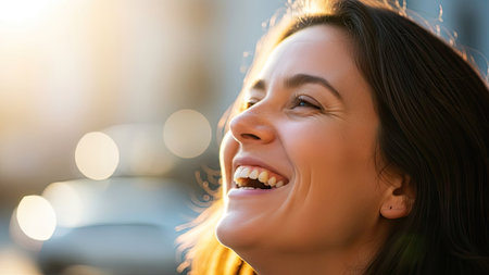 A woman is shown smiling with her head tilted back, illuminated by warm sunlight. The image exhibits a shallow depth of field, with soft focus on the background. The scene suggests an outdoor setting, possibly during the daytime. Suitable for diverse applications, including marketing, advertising, and editorial content.