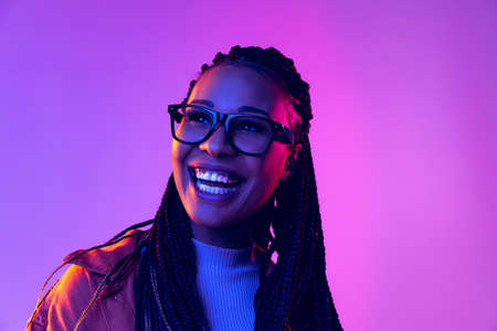 Portrait of female fashion model in cotton shirt isolated on purple background in neon light. Concept of beauty, art, fashion, youth and emotions