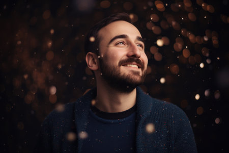 A smiling man in a festive hat looks up in wonder, surrounded by colorful bokeh lights and confetti.